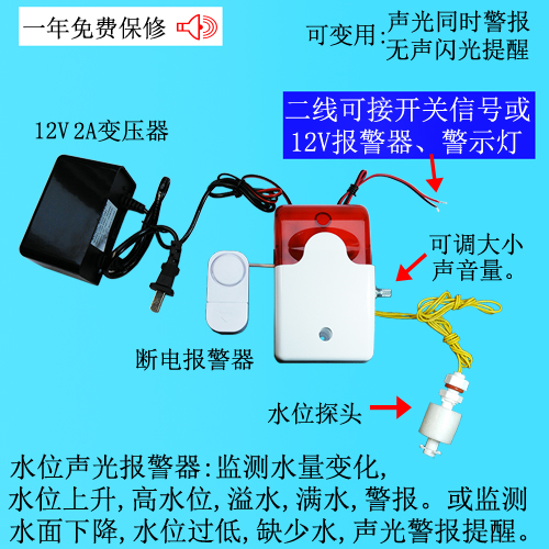水位声光报警器,高水位低水位闪光报警器,高低水位提醒器,感应高低水位警报器,满水报警器,水满报警器,溢水报警器,水面报警器,水面高低报警器,限定位水面高、低报警器,少水提醒器,多水提醒器,有水提醒提示器,没有水提醒提示器,潮水上涨、下退水报警提醒器,水位上涨报警器自动拨打手机提醒器,防水报警器,漏水报警器,流水报警器,水位上升报警器,水位下降下落报警器:适用在水池、水库、水利、水塘、鱼塘、养殖池、水箱、虾池 、矿井、地下室、深井、养殖场、水泵房、水塔、低位地点、大坝、地下通道、地铁路隧道、人工湖、河道、蓄水池、河流等地点使用。